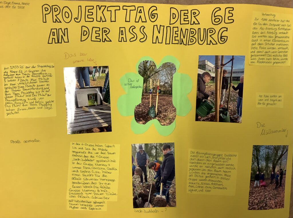 Weil zu der Zeit in Nienburg auch das 1000 jährige Stadtjubiläum gefeiert wurde und zu der Aktion „1000 Jahre – 1000 Bäume“ aufgerufen wurde, wollten wir gerne einen Baum auf dem Schulhof pflanzen. Um Geld für den Baum zusammen zu bekommen, haben wir in der Projektwoche Buchstabenfotos in Nienburg gemacht und diese verkauft. So konnten wir genug Geld sammeln um einen Baum zu kaufen.
