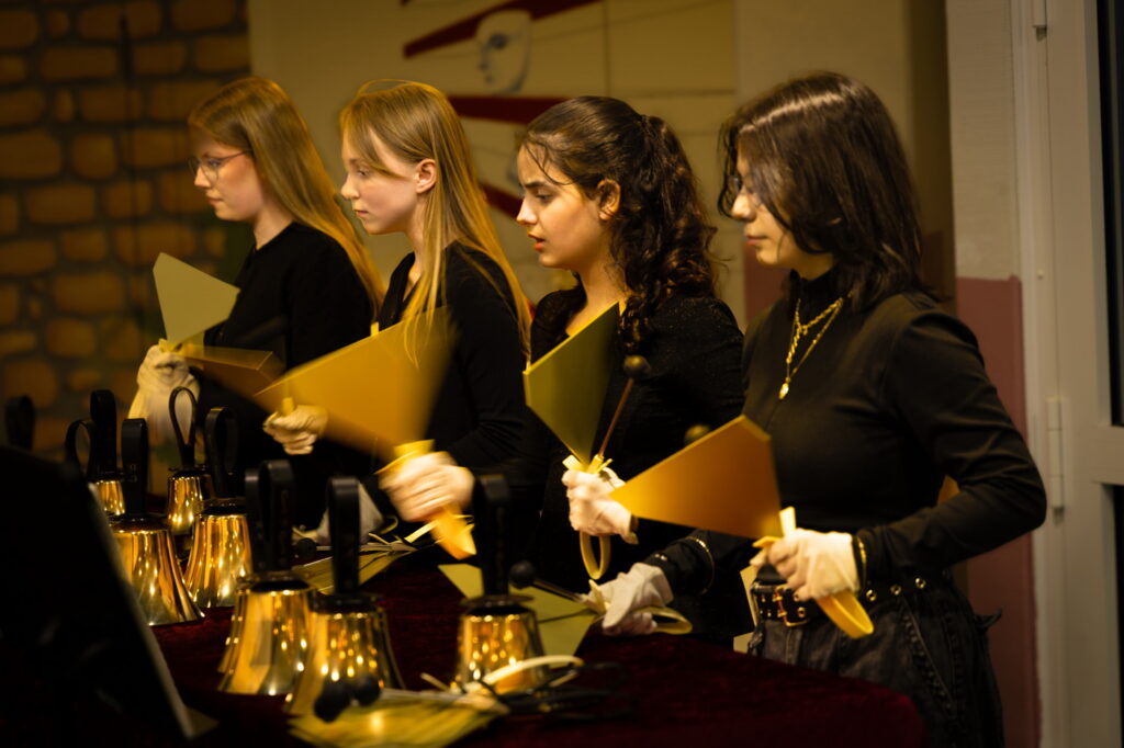 Zur ersten Tasse Tee lud die Bläsergruppe Jahrgang 5, die, unter der Leitung von Elisabeth Vogels, mit Stücken wie >Mit dem Strom< oder >Go tell Aunt Rhodie< für einen wohltuenden Start sorgte. Für Glockentöne, passenderweise >Jingle Bells<, sorgte dann, wie kann es anders sein, die Glocken-AG, deren Mitglieder den Weihnachtsklassiker wie auch Stücke wie >Jolly Old Saint Nicholas< oder den >Rustic Mallet Dance< schon so gekonnt darboten, dass man gar nicht merkte, dass sie eigentlich noch ‚Anfänger‘ an den Handglocken sind. >Golden< und >Somewhere in my memory< waren dann dem bereits arrivierten Handglockenensemble, wie die Glocken-AG unter der Leitung von Dr. Diemut Eickhoff, vorbehalten, und nicht nur akustisch, auch optisch waren die blitzenden goldenen Glocken ein Genuss.