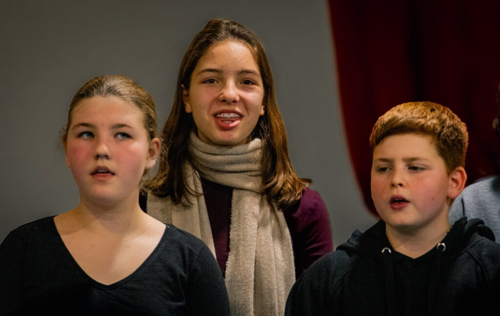 Einen musikalischen Blumengruß sandte dann die Chor-AG Jahrgang 5 bis 8 mit >Winter Rose< ins Publikum, und mit dem Lied >Freuet euch< nahm man die Stimmung im Publikum förmlich auf. Elisabeth Vogels begleitete den von Christina Hinzmann-Suckel dirigierten Chor sicher am Klavier.